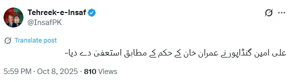 The PTI also confirmed the development on its official X account: “Ali Amin Gandapur has resigned as per Imran Khan’s directive.”