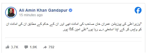“The role of the chief minister was Imran Khan sahib’s amaanat (entrustment) and as per his order, I am returning his amaanat and submitting my resignation,” a post on Gandapur’s official Facebook account quoted him as saying.