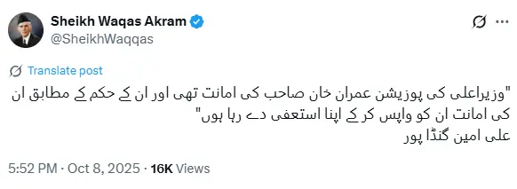 PTI Information Secretary Sheikh Waqas Akram also shared the same statement on X, attributed to Gandapur.